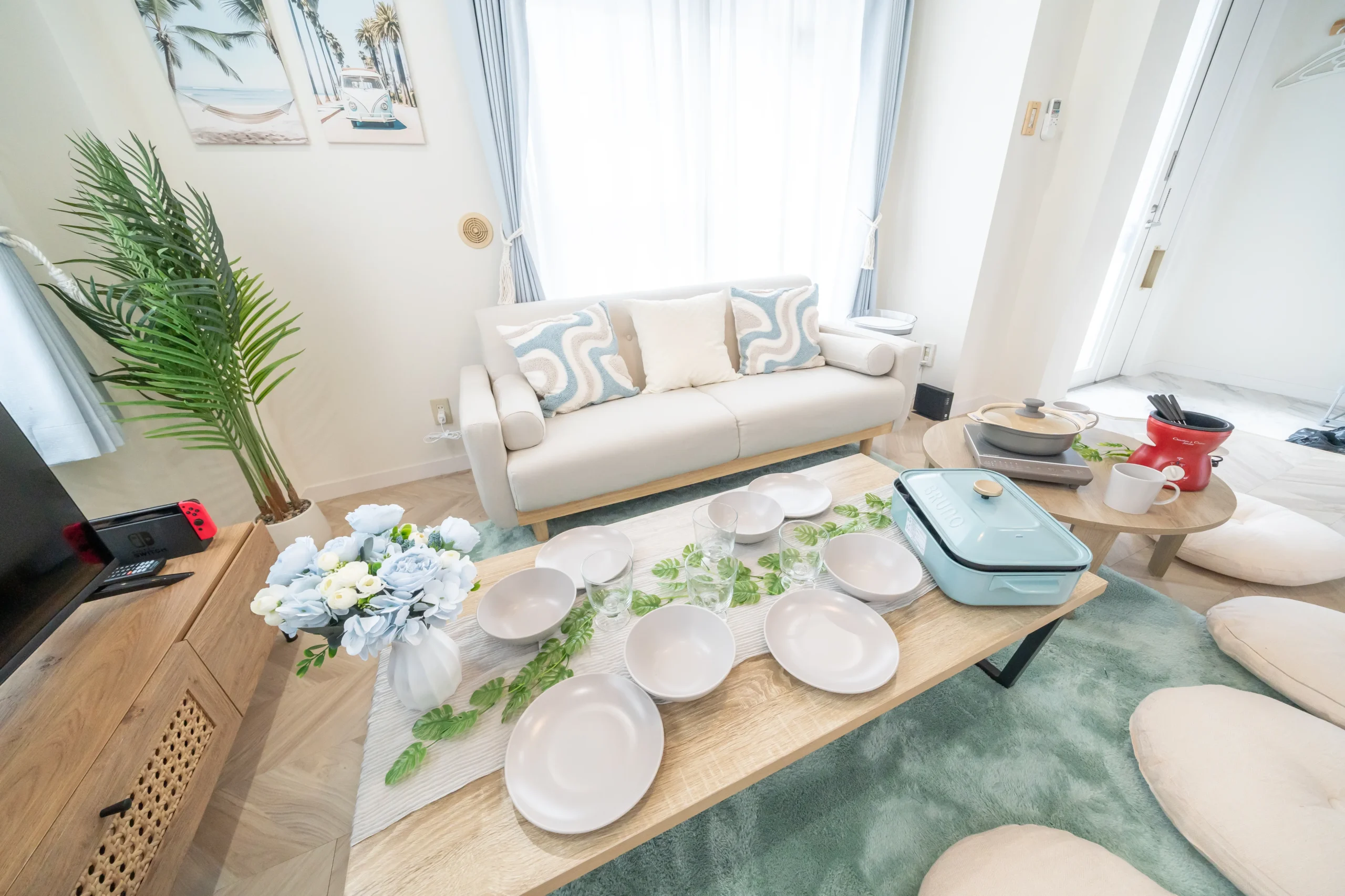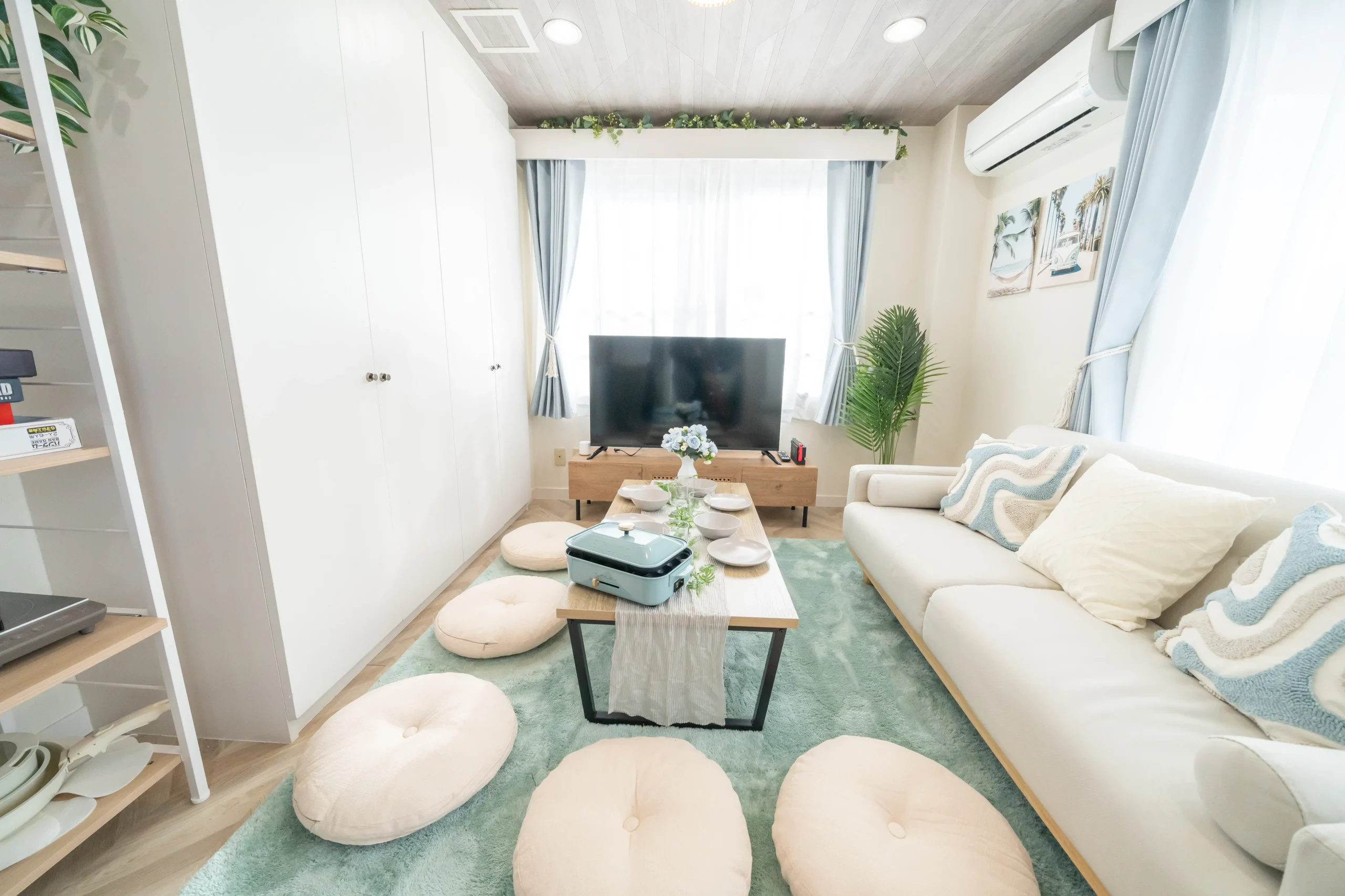 水色と白を基調とした、湘南らしいリゾート感溢れるインテリアでワクワク。ラグマットもあって居心地抜群!