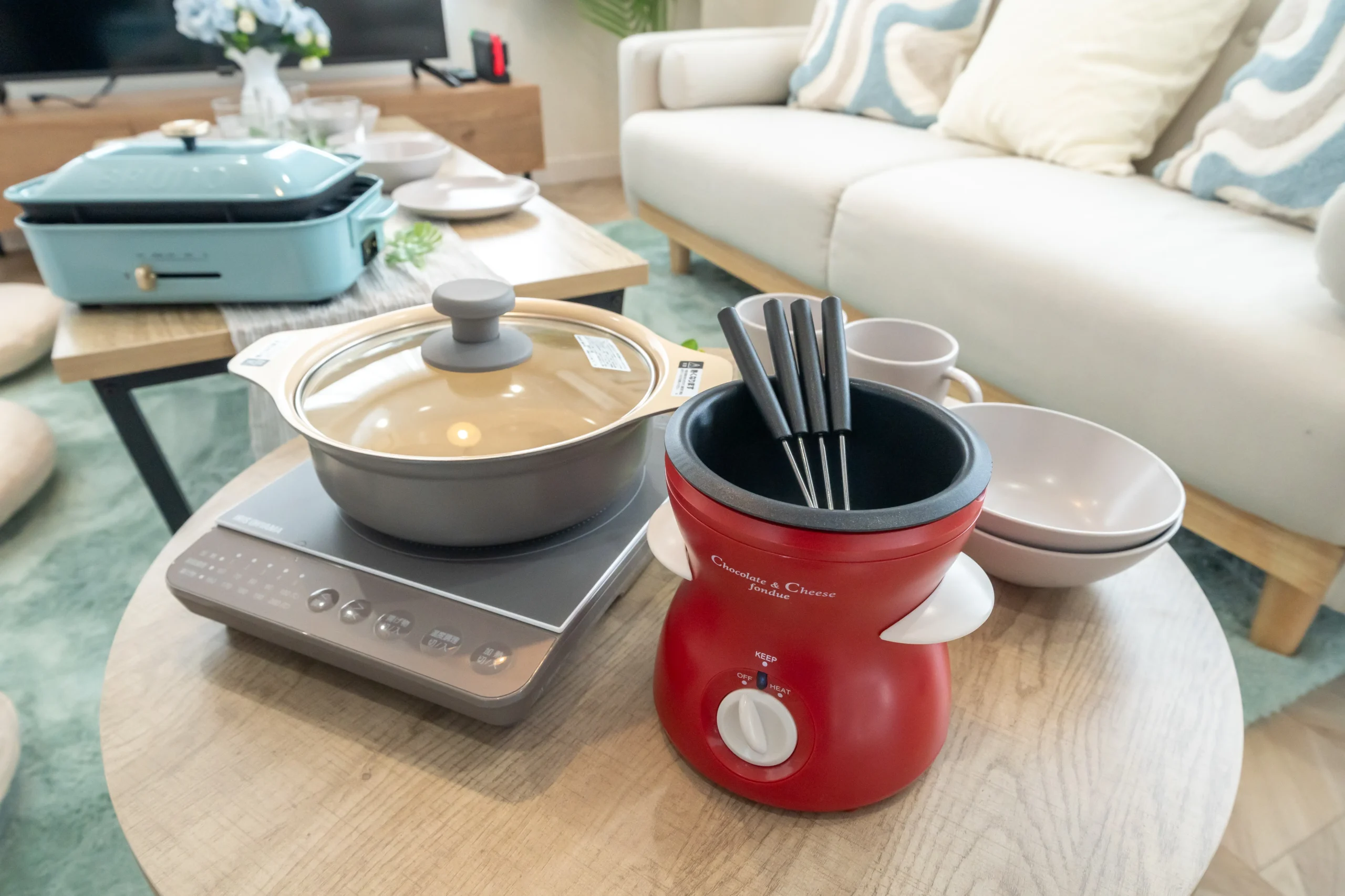 たこ焼き器や卓上鍋、チーズフォンデュ鍋、お皿やカトラリーなど、パーティが楽しくなるキッチン設備が充実しています!