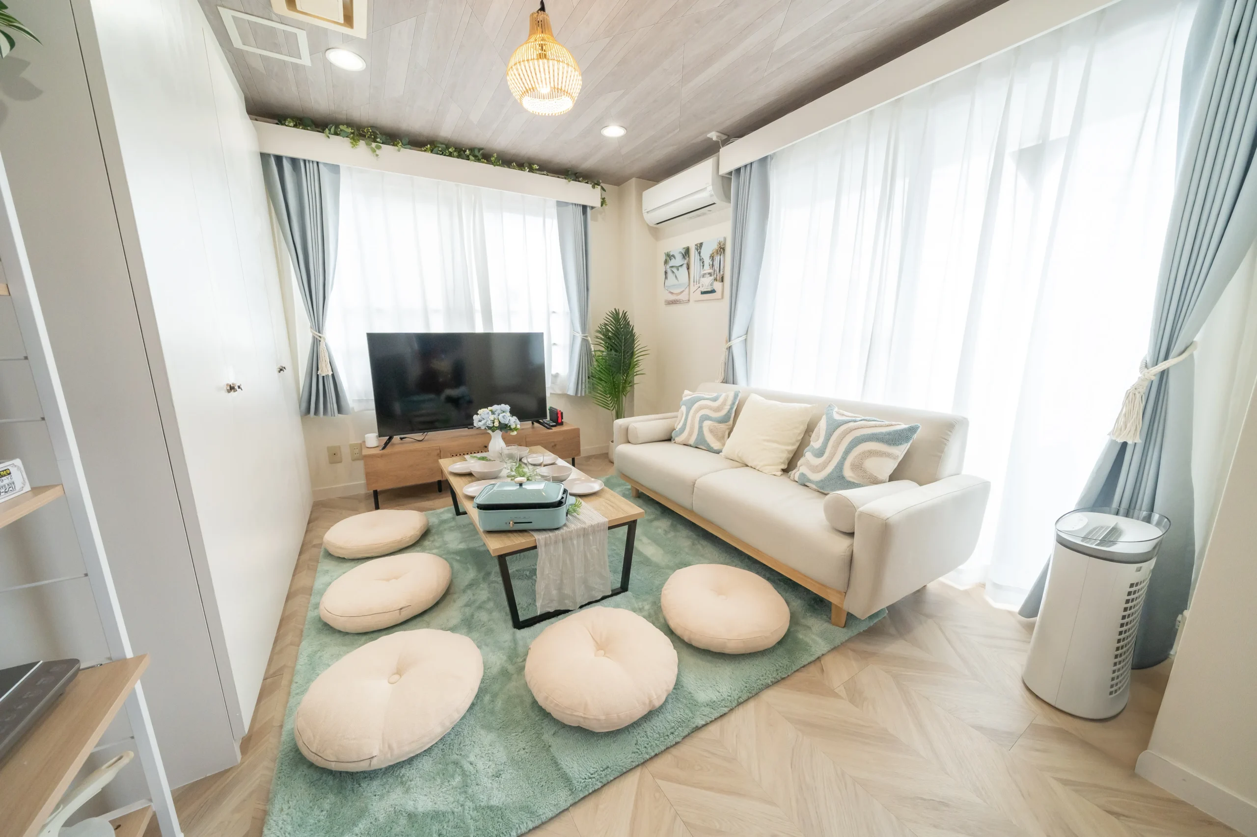 ▼家電・50型テレビ×1(HDMI接続可)・DVD、Blu-rayプレイヤー×1・冷蔵庫×1・電子レンジ×1・電気ケトル×1・エアコン×1・充電器(ライトニングiOS・Type-C・Micro USB)・LEDリングライト・女優ミラー・LEDキャンドルライト×5・HDMIケーブル