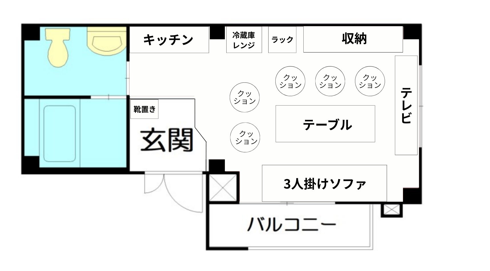 ▼家具・長テーブル×1・丸テーブル×1(折りたたみ式)・ソファ×1・座椅子×6